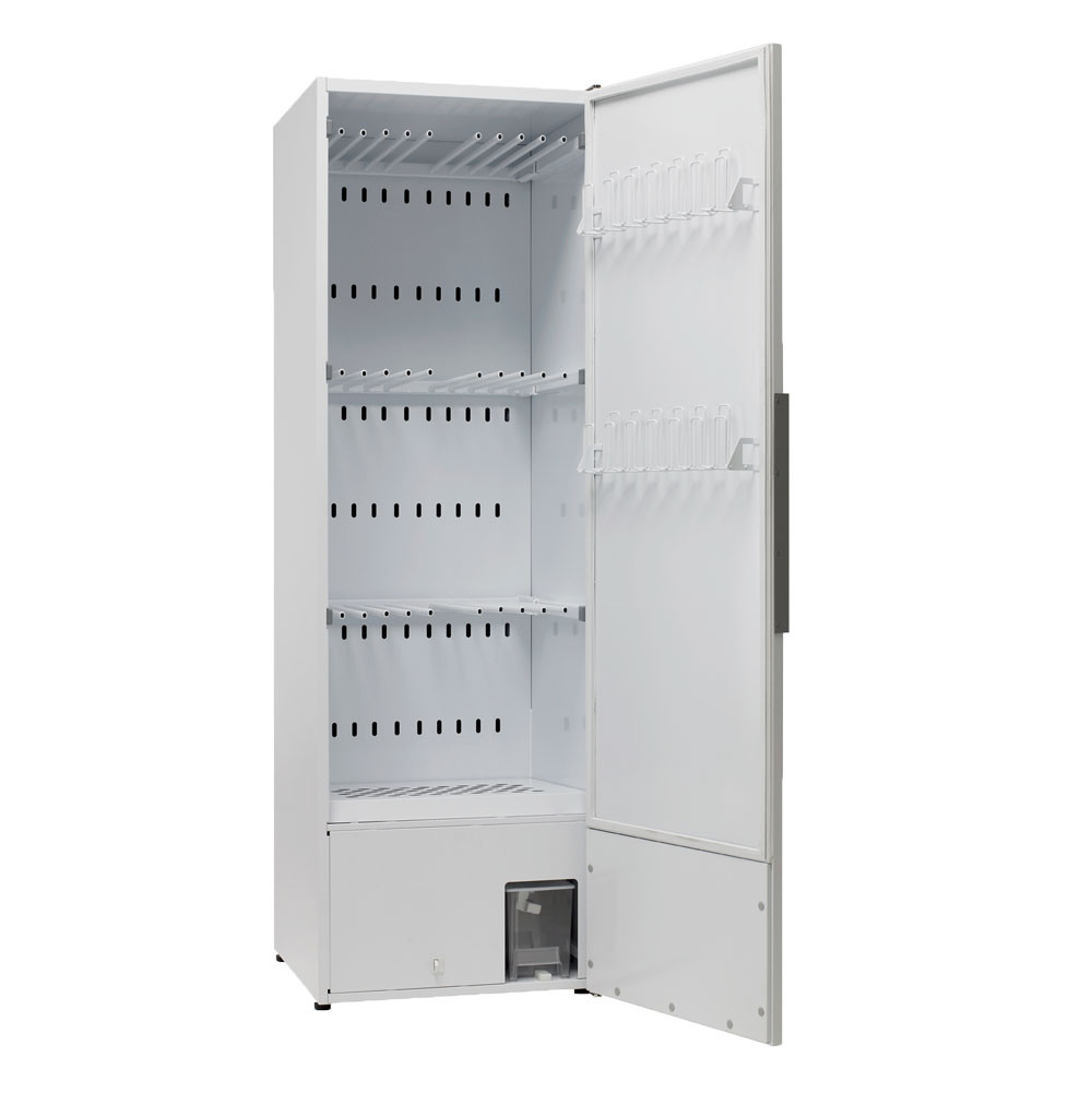 Die Wärmepumpe verteilt über die Öffnungen in der Rückwand einen regelmässigen Trockenluftstrahl ins Innere des Trockenschrankes. Die entzogene Feuchtigkeit wird in einem leicht zu entleerenden Auffangbehälter unterhalb des Schrankes aufgefangen. Mittels eines Schwimmers meldet der Trocknungsschrank automatisch, dass der 2-Liter-Behälter entleert werden muss. Alternativ kann der Auffangbehälter für die automatische Entleerung über einen Schlauch an das Abwassersystem angeschlossen werden.